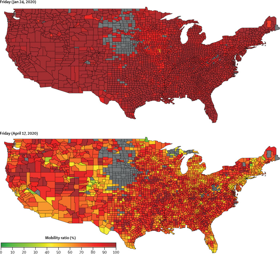 Figure 3: Mobility across the United States pre/during Covid. Mobility ratio is defined as the ratio of the vehicles travelling on the road at an instant to the capacity of the vehicular traffic.