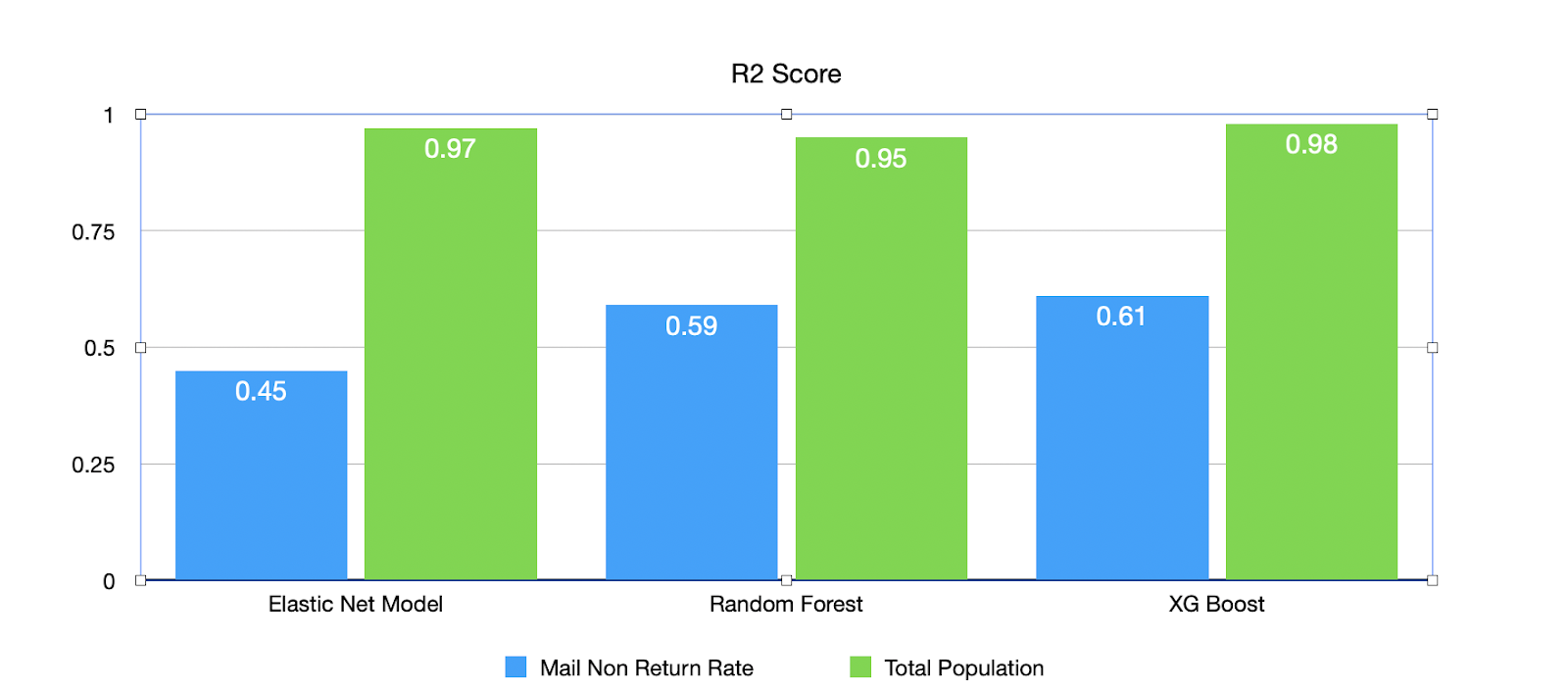 Our models predicted that Total Population is more accurate than the Mail Return Rate (r2 score 0.98 vs. 0.65), and XGBoost is the best predictor.