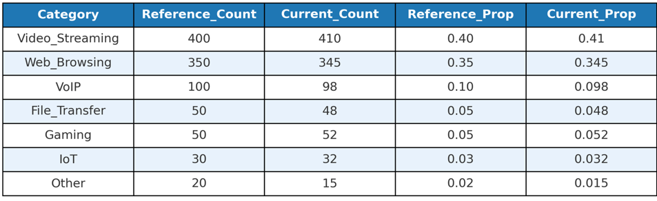 - Calculate proportions of each individual category for both the reference and current populations. Considering the total aggregate volume for the months of January and February are 1000 each. We divide each category by 1000 to compute their relative proportions.