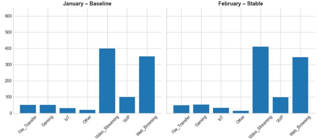 - Considering the January month of the attribute “traffic_type”, we list the individual categories such as File_Transfer, Gaming, IoT, Other, Video_Streaming, VoIP and Web_Browsing.