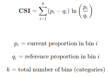In simple terms, Characteristic Stability Index (CSI) helps quantify the degree of the data drift of categorical variables across any two given populations. The formula to calculate CSI is as follows: